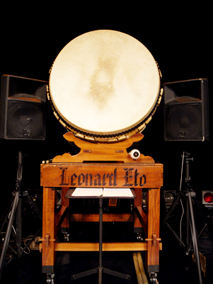 草月ホールという会館は非常に音響が良いので生音でやる事が多いのですが、今回はシーケンスの音が入るという事で必然的にPAシステムを導入。でも、太鼓とドラムスは生音だったりして、そうするとタップの音はどうするか?という音の流れのバランスが難しく、会場ギリギリまで「音合わせ」をしていました。音に拘るからこそ、そこの部分だけはキチンと納得するまで詰めるというレナードさんの姿勢がとても印象的なライブでした。