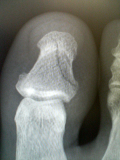 写真では軽くヒビくらいに見えますが、横から見ると意外に線が沢山入ってまして、お医者さんは「折れたっていうよりは『潰れた』って感じだね」って仰ってました、、、てへっ。
